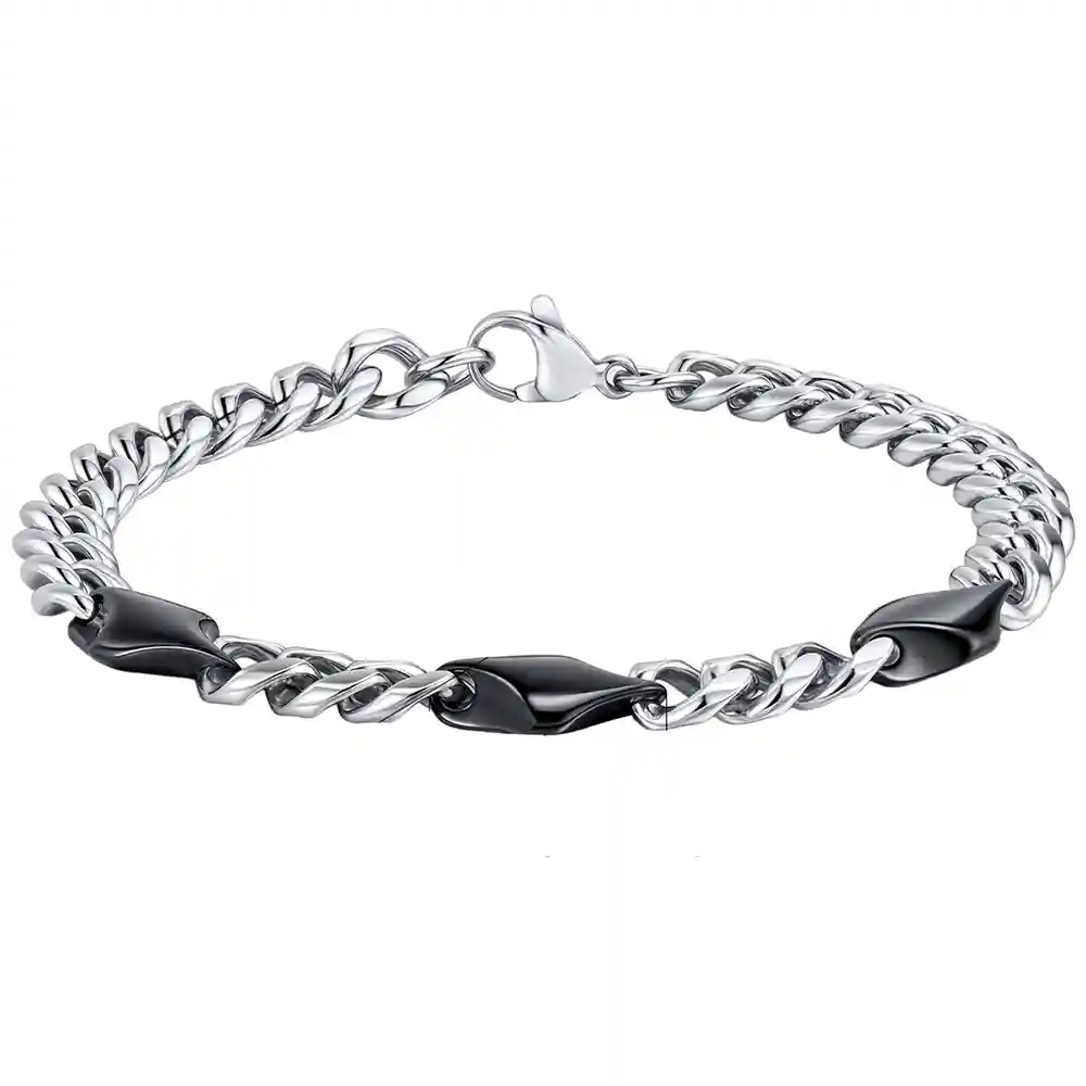 Miesten rannekoru, joka yhdistää klassisen ketjumuotoilun ruostumattomasta teräksestä mustiin akaatti yksityiskohtiin, antaen korulle rouhean ja modernin ilmeen. Kontrasti kiiltävän teräksen ja mustien, sileiden elementtien välillä luo näyttävän ilmeen, joka sopii täydellisesti tyylitietoiselle miehelle.