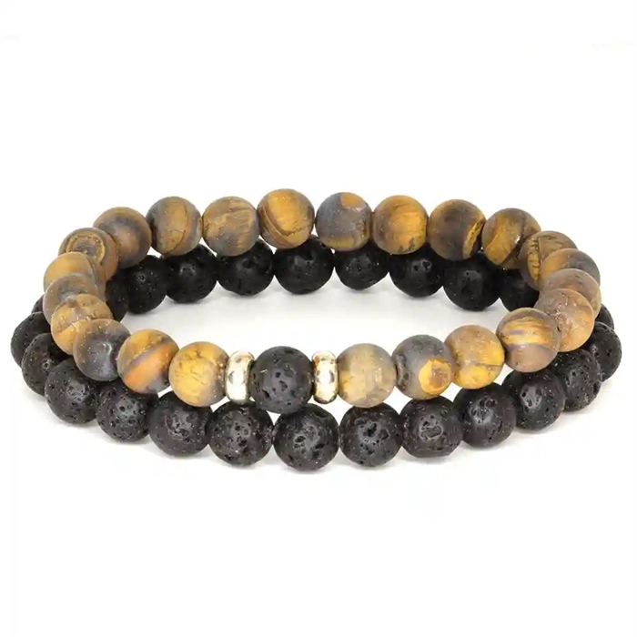 Maskuliininen ja tyylikäs helmirannekoru miehille, joka on koottu 8 mm laavakivistä ja matasta tiikerinsilmästä, mikä antaa rouhean ja eksklusiivisen ilmeen. Mustien laavakivien ja lämpimien, mattapintaisten tiikerinsilmän sävyjen yhdistelmä tekee rannekorusta ihanteellisen sekä arkikäyttöön että muodollisempiin asuihin.