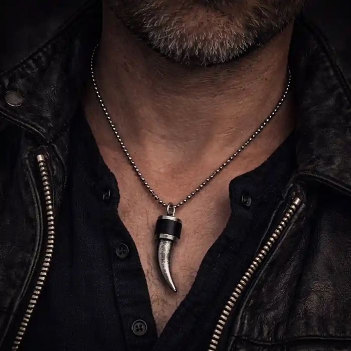 Riipus on noin 1,3 cm leveä ja 5 cm pitkä, mikä luo näyttävän mutta tyylikkään designin. Tumman ketjun ja rouhean riipuksen yhdistelmä tekee tästä maskuliinisen korun, joka sopii täydellisesti sekä arkeen että rouheampiin asukokonaisuuksiin.