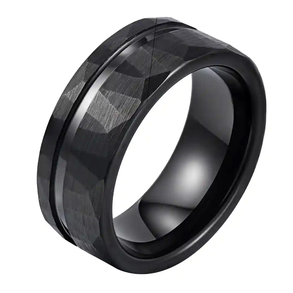 Obsidian Edge on musta tungsten-sormus miehille, suunniteltu selkeällä fasetoidulla pinnalla ja mattapintaisella kiillotetulla reunalla, joka antaa rouhean ja eksklusiivisen ilmeen.