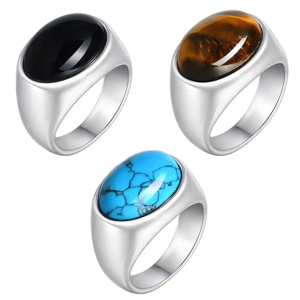 Maskuliininen ja tyylikäs signet-sormus miehille ruostumattomasta teräksestä, koristeltu ovaalilla aidolla Tiger Eye -kivellä.