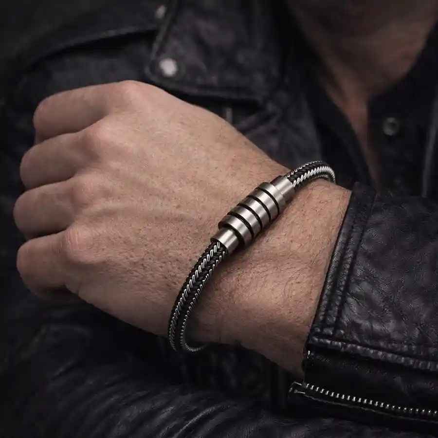 Moderni ja maskuliininen miesten rannekoru ruostumattomasta teräksestä, suunniteltu miehelle, joka arvostaa tyyliä ja voimaa.