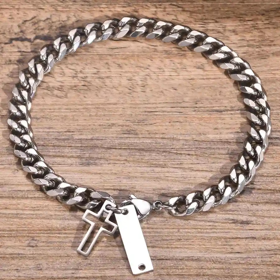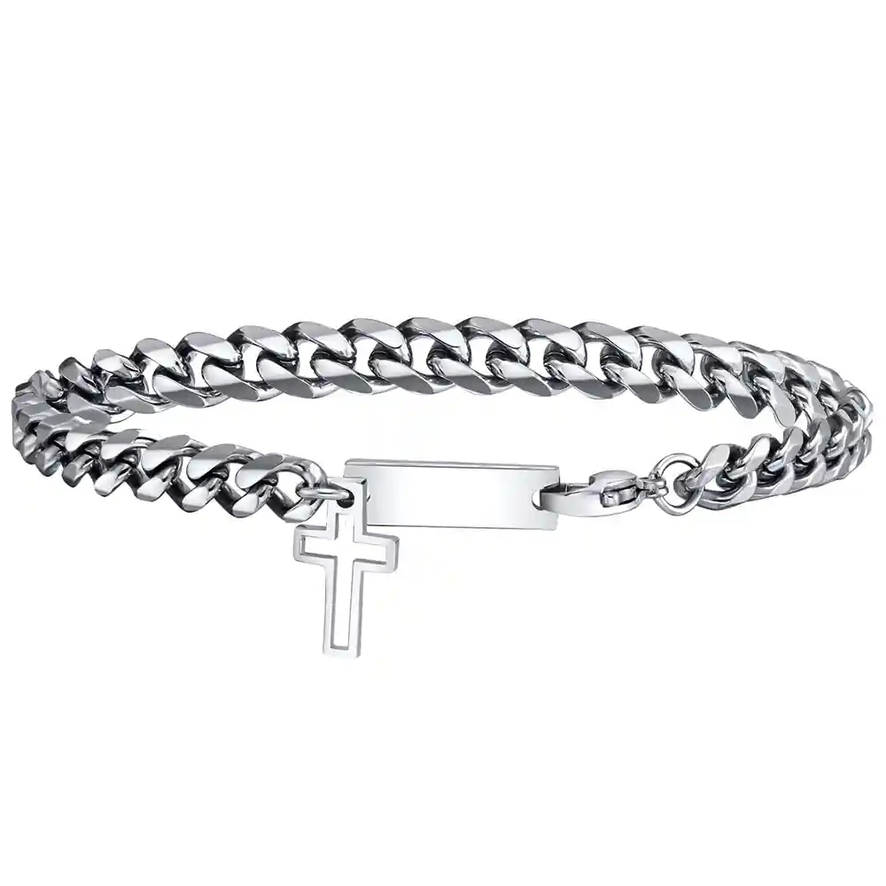 Voimakas ja tyylikäs miesten rannekoru ruostumattomasta teräksestä, jossa on klassinen ristiriipus.