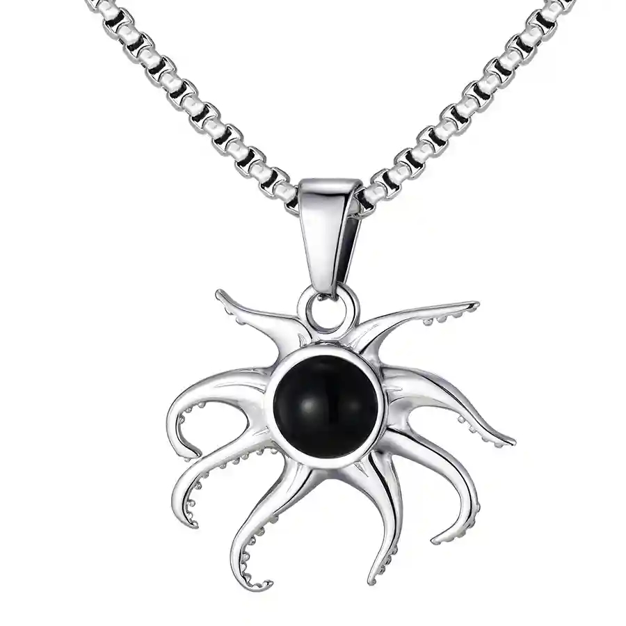 Tämä miesten kaulakoru yhdistää raakaa voimaa ja yksityiskohtaista muotoilua yhdeksi huomiota herättäväksi koruksi. Riipus on muotoiltu voimakkaaksi mustekalaksi, jolla on kiertyvät käsivarret ja syvänmusta kivi keskellä, mikä tuo tummaa ja maskuliinista ilmettä.