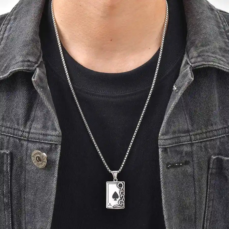 Ruostumattomasta teräksestä valmistettu vanhan koulukunnan kaulakoru, jossa on Ace of Spades -motiivi.