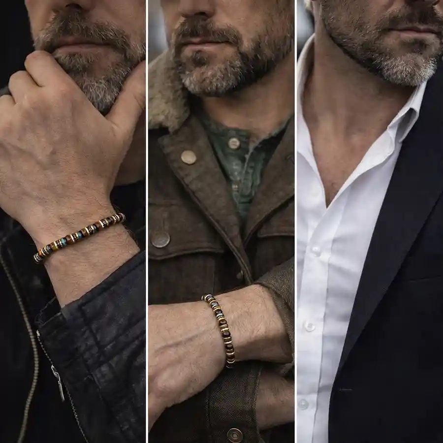 Tämä tyylikäs miesten rannekoru Tiger Eye -kivillä yhdistää maskuliinisen muotoilun ja luonnollisen tyylin. Upeat 7 mm kivet lämpimissä ruskeissa ja kullan sävyissä antavat rannekorulle ylellisen ilmeen, kun taas kiillotetut teräsosat luovat modernin ja pelkistetyn lookin.