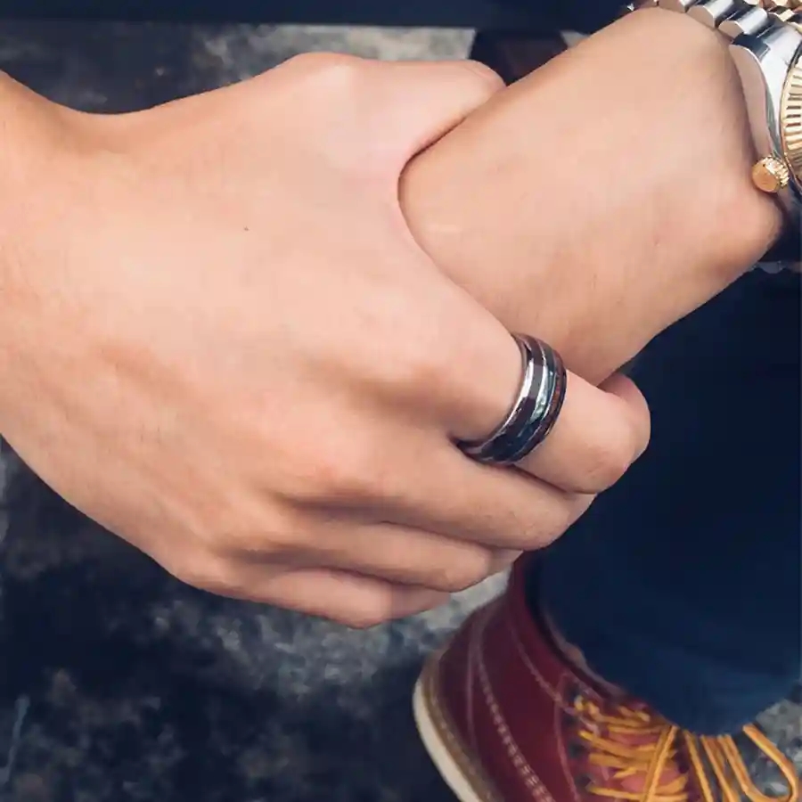Tämä eksklusiivinen tungsten-sormus yhdistää voiman ja luonnon eleganssin.