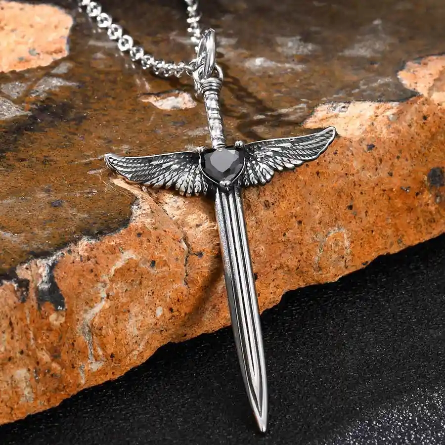 Maskuliininen ja symbolinen kaulakoru miehille, suunniteltu miekaksi, jossa on siivet – voiman, vapauden ja suojelun symboli.